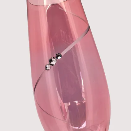 The flute is made from pink crystal and has a long elegant stem and has a cut around the entire glass which adjoins three Swarovski crystal beads.