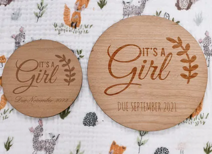 Let the world know you are about to have a beautiful baby girl with this personalised wooden baby announcement sign. This is an ideal gift for new parent's and a great photo prop to add to your gender reveal announcement.