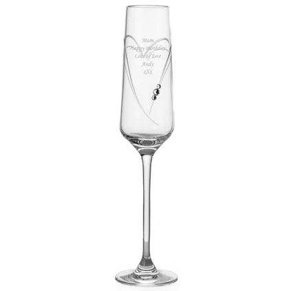 Our "Just For You" personalised champagne flute would make a beautiful gift for any occasion. It comes with one of our attractive branded gift boxes and features a deep cut heart design that wraps around the flute and is adorned with three Swarovski crystal elements.