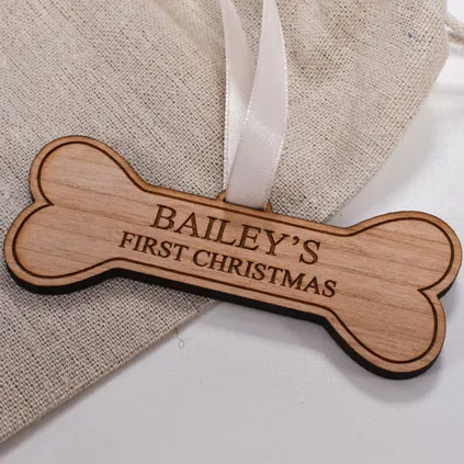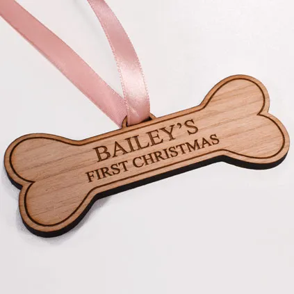 - This engraved dog bone wooden bauble can be personalised with any name and a short message below.